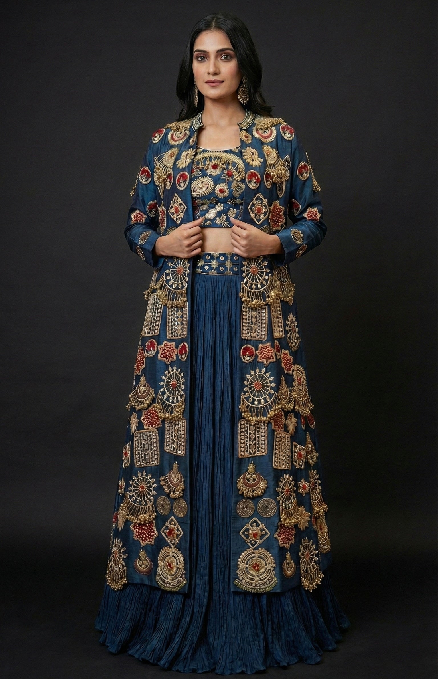 Includes: Lehenga, Blouse & Embroidered Long Jacket
